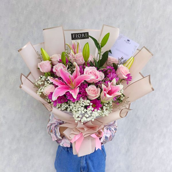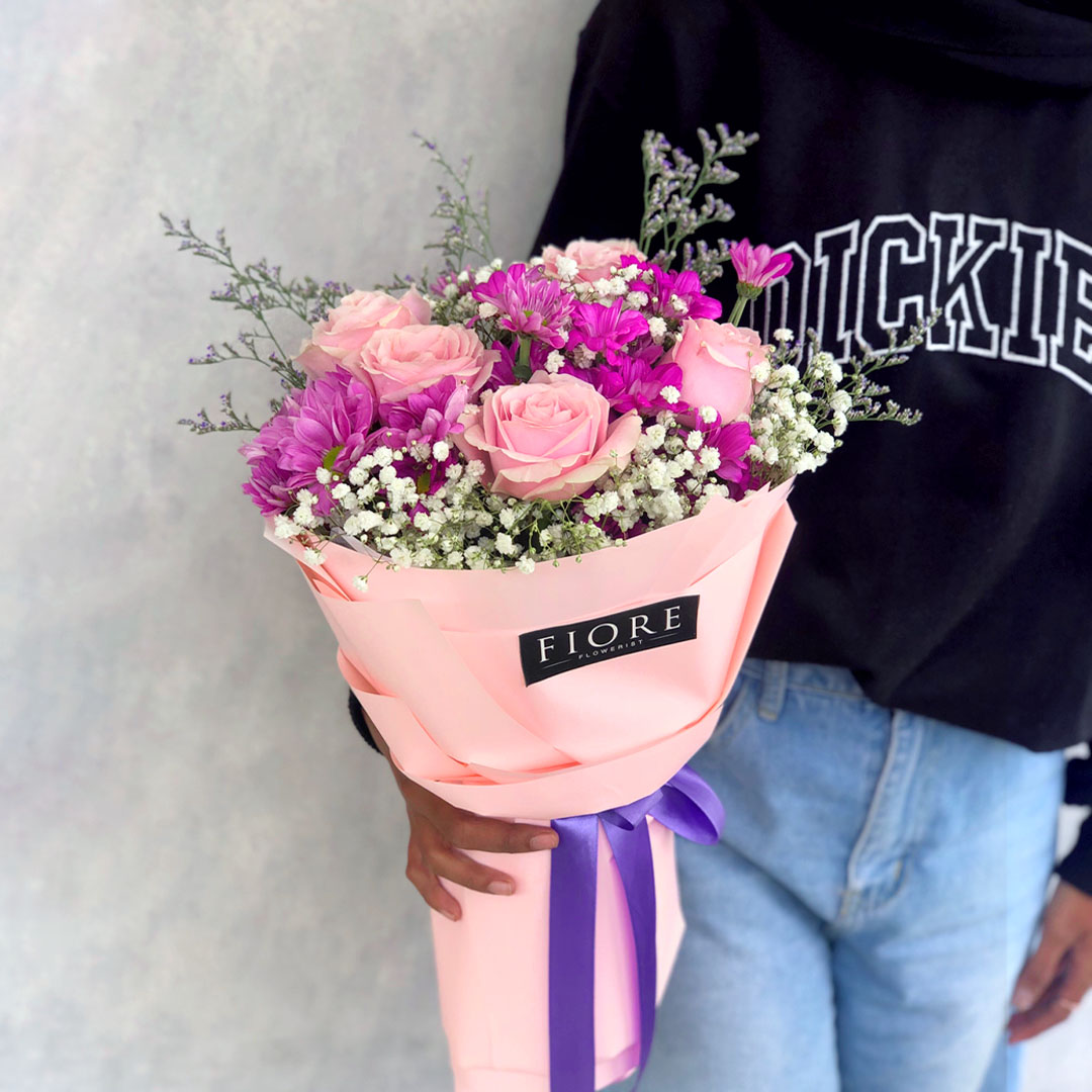 Terdiri dari bunga mawar, aster dan filler impor. Cocok untuk birthday, baby shower, lamaran, grand opening dan acara lainnya.