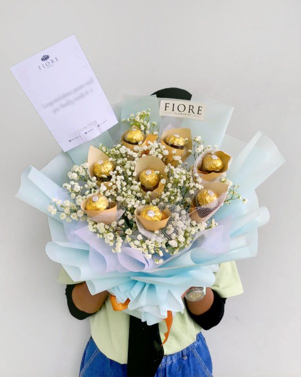 Rangkaian buket yang terdiri dari ferrero yang dipadukan dengan baby breath. Snack bouquet adalah pilihan tepat karna bisa dimakan dan cantik secara visual untuk kado.