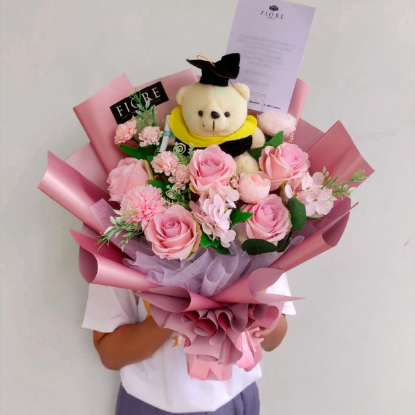 Terdiri dari bunga mawar dan mixflower palsu sehingga dapat dipajang dalam jangka waktu yang lama dan tetap cantik.